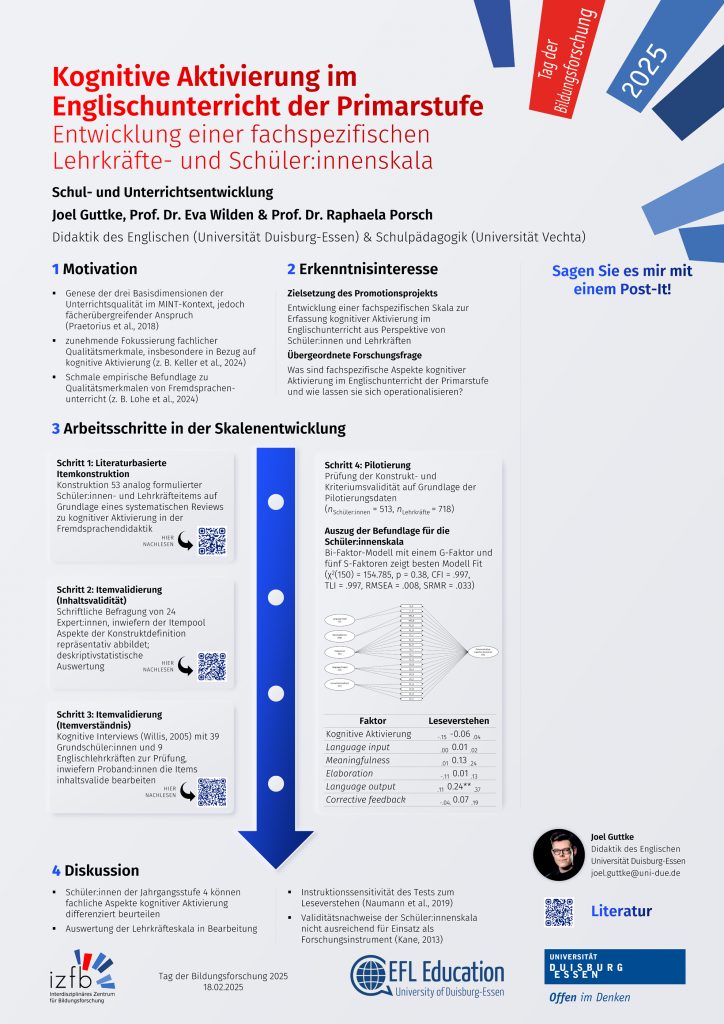 Am 18.02.2025 wurde mein Poster „Fachspezifische Aspekte kognitiver Aktivierung im Englischunterricht der Primarstufe: Entwicklung einer Lehrkräfte- und Schüler:innenskala“ auf dem Tag der Bildungsforschung mit dem Posterpreis ausgezeichnet. Ausgerichtet wurde die Veranstaltung vom Interdisziplinären Zentrum für Bildungsforschung (IZfB) an der Universität Duisburg-Essen. Ich danke der Posterjury für die Begutachtung der 50 eingereichten Poster und für die Wertschätzung meiner Arbeit.